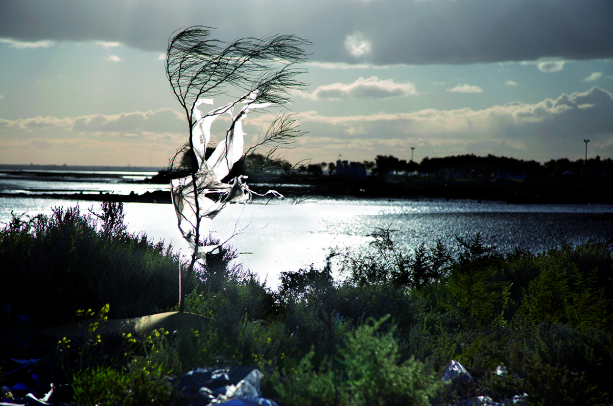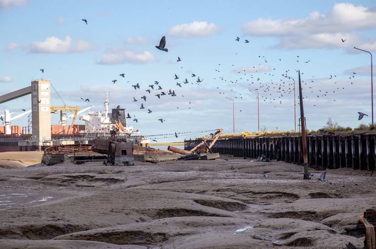El naturalista habla de esta región que ahora, a comienzos de abril, se ve de un plateado arrogante, una mezcla de humedad, barro, el reflejo de sol de la tarde. Agustín Rodríguez, investigador y coordinador de Isla Invisible, un proyecto que desarrolla residencias artísticas en los alrededores del sistema de islas de Bahía Blanca, devela los signos que aparecen escondidos: islotes a lo lejos, agujeros en el suelo, minúsculas casas de cangrejos, gaviotas, chimangos, lo silvestre está acá nomás. “La cuestión es que los distintos momentos históricos del desarrollo de Bahía la han puesto en pos del capital y no tanto del ambiente —dice—. Con un juego de palabras muy malo, Bahía Blanca era Bahía en Blanco, como si fuera una tabla rasa y lo que haya que hacer se hace”. El recorrido sigue por las afueras del polo petroquímico, donde gigante en forma de tanque, tubos, una maraña de metal y gases se levanta entre pastos bajos y los barrios que quedaron a su vera.