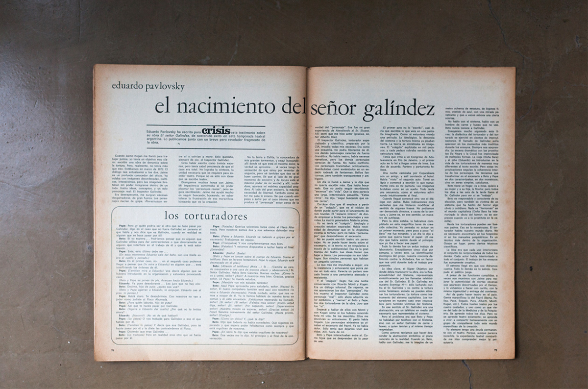 Cuando Jaime Kogan me llamó para trabajar juntos, yo tenía un objetivo muy claro: escribir una obra de denuncia sobre la tortura. Pero, realmente, no tenía más que eso. Estábamos en marzo de 1972. El diálogo nos entusiasmó a los dos. Jaime es un profundo conocedor del oficio. Yo volaba con imágenes desordenadas, caóticas, intensísimas, pero las imágenes brotaban sin poder integrarse dentro de un todo. Había ideas, conceptos, y un solo personaje real: El inspector Galíndez.