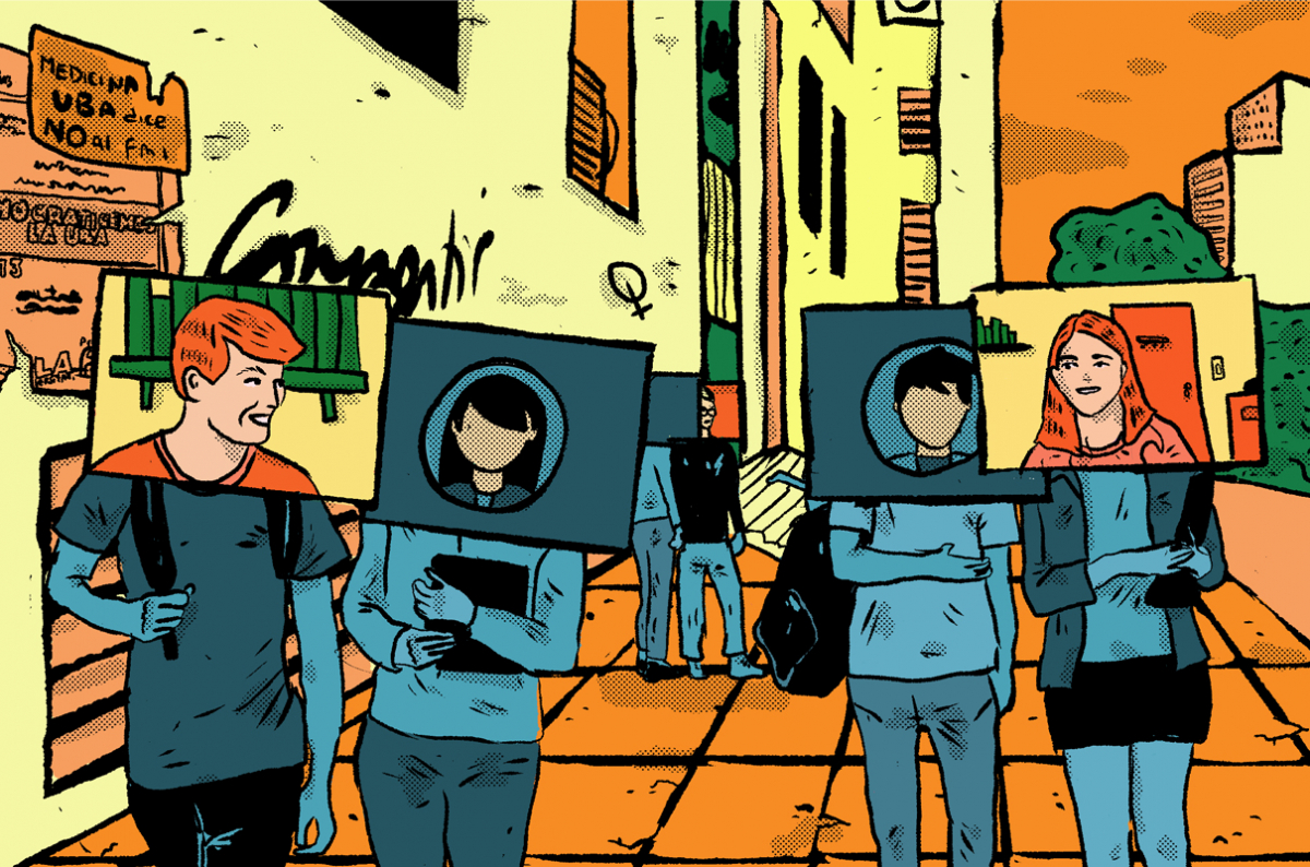 El ejemplo más ilustrativo de todos estos procesos es el de la App de citas OKCupid. Al no tener la oportunidad del levante cara a cara, los alumnos recurrieron a esta plataforma, en la cual, para participar, debían llenar un perfil larguísimo, lleno de preguntas, para poder ser potencialmente emparejados con gente más afín que en otras como Tinder. Y hete aquí que, por medio del loop algorítmico de la App, a los alumnos les aparecían personas que rápidamente, por el nombre o por la foto, reconocían como compañeros de alguna asignatura de la facultad. O sea, todo tu perfil le indicaba al Sr. Cupido Digital que podías tener onda con aquel o aquella con quien, de haberte visto en el mismo aula, el mismo pasillo o el mismo patio, vos lo podrías haber sabido antes.