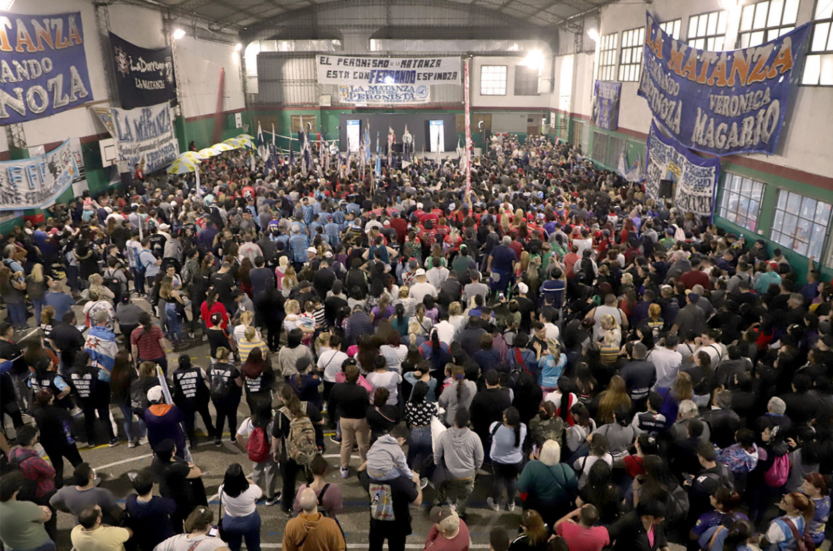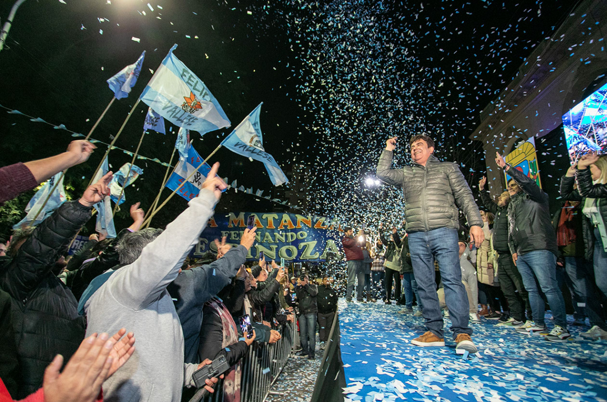 A una cuadra el clima era festivo: banderas desplegadas, caras de jolgorio y felicidad, y un espectacular despliegue policial esperaban al ganador de la noche. Se cantó la marcha una, dos veces, hasta que apareció Espinoza. Se subió al escenario, intentó hablar, pero finalmente, con mucha fuerza, se cantó: “La Matanza es de Evita, La Matanza es de Perón, para todos los traidores, es Fernando Conducción”.