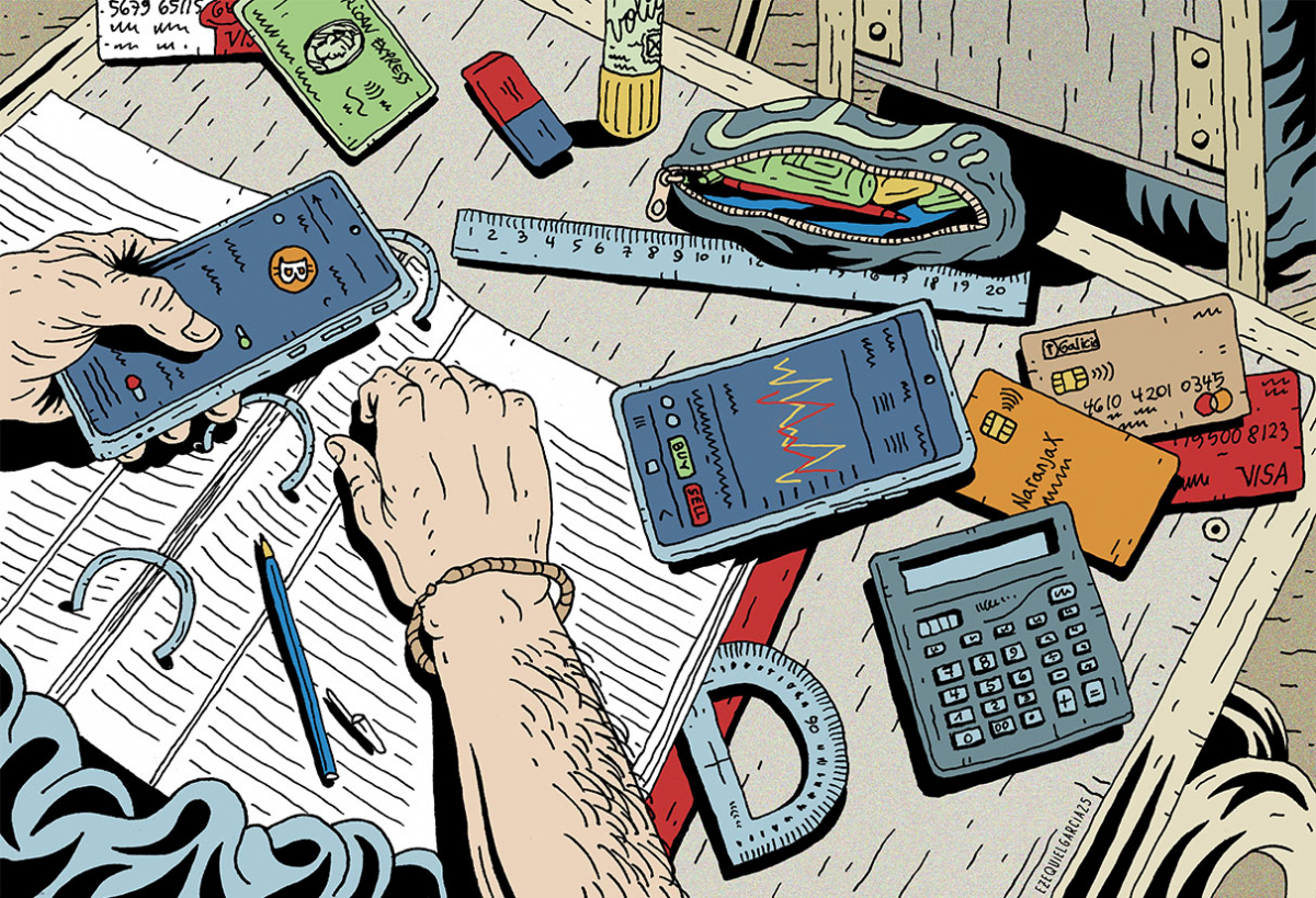 En abril de 2023, en un cumpleaños de 80, un adolescente de quinto año que cursaba en la escuela ORT hablaba con pasión de sus sueños por transformar y mejorar la sociedad con un grupo de invitados que lo miraban con perplejidad y cierto desdén. “Yo quiero ayudar a la gente de las villas a salir adelante, les quiero enseñar a operar en activos NFT (Non-Fungible Token) y en criptomonedas”. Los siete sesentones y cincuentones que lo escuchaban intentaban explicarle que las necesidades de los barrios populares eran otras y que la manera de ascender socialmente era a través de lo que ellos consideraban un trabajo digno y… educación. Moiguer pone en duda quién tenía en esa escena los pies mejor apoyados en la tierra: “En 2020, antes de la pandemia, había 400.000 argentinos inscriptos en la Bolsa de Valores con cuentas comitentes, hoy hay 12 millones”. La cifra representa un cuarto de los habitantes del país, por lo que podría inferirse que la mayoría de los hogares integran ese universo. El consultor admite que buena parte de esas personas son quienes obtuvieron billeteras virtuales que les permiten realizar sus consumos diarios, pero enseguida aclara que también utilizan esas cuentas para depositar su salario en ellas con el objetivo de obtener intereses y aumentar en algo sus magros ingresos, para colocar dinero a plazo fijo, fondos de inversión, comprar dólar MEP, Balanz y Bitcoin, entre otras operaciones financieras y especulativas que para un sector –que no necesariamente pertenece a las elites– se volvieron habituales.