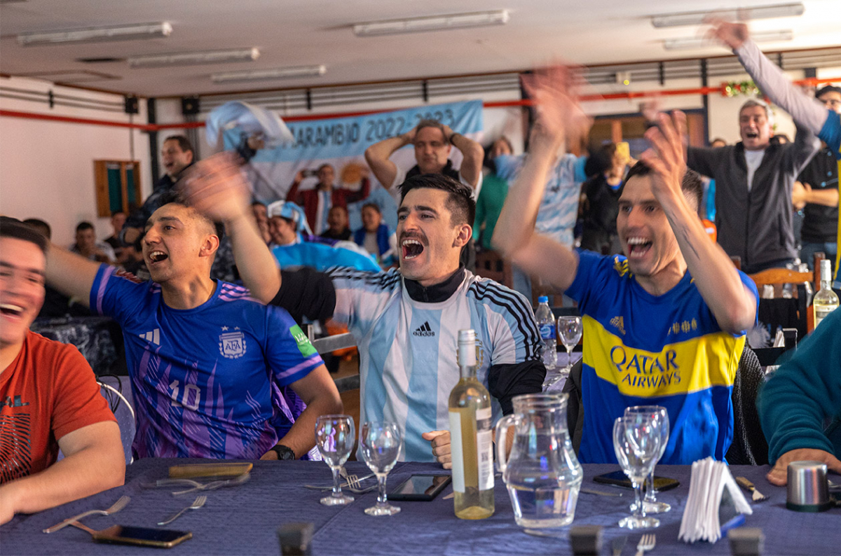 A simple vista, podría ser cualquier bar de cualquier rincón del país a la espera de la final que jugará Argentina: mesas largas, carne en el plato, los cuerpos inclinados en tensión hacia la pantalla gigante que proyecta esa película que volveremos a ver mil veces. Entre los parroquianos, una mayoría de camisetas de Messi, banderas albicelestes en las paredes, los cantos en las mesas que replican en eco servicial las oleadas de oleléolalá que llegan de la tele, y un bombo pintado y un saxo ocupados de las armonías cuando se cante una y mil veces la canción que sabemos todos.